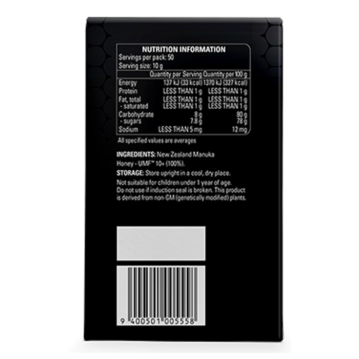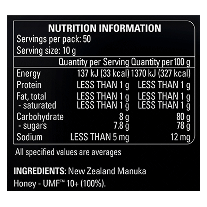 Mật ong Mānuka 100% UMF ™ 10 + tinh khiết được thu hoạch nguồn nguyên liệu hoang dã, đã qua kiểm định và được chứng nhận không chứa gluten.
