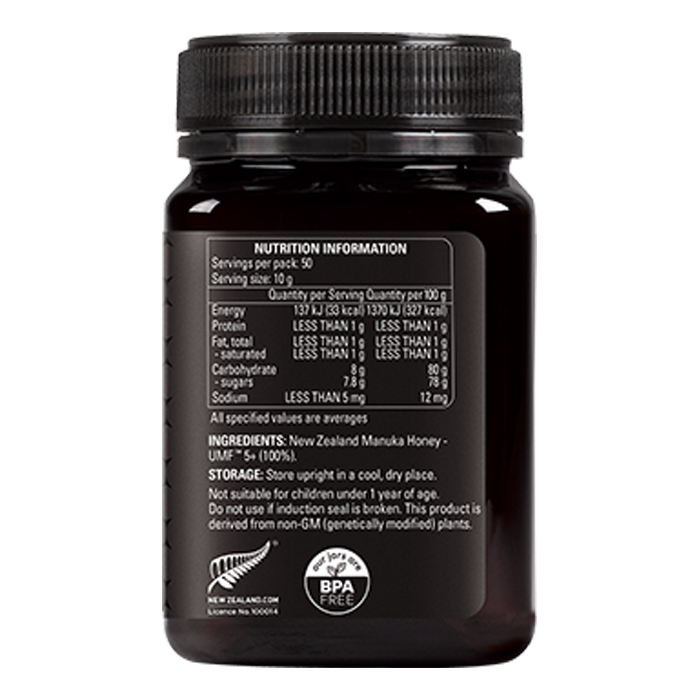 Mật ong Mānuka 100% UMF ™ 5+ tinh khiết được thu hoạch nguồn nguyên liệu hoang dã, đã qua kiểm định và được chứng nhận không chứa gluten.
